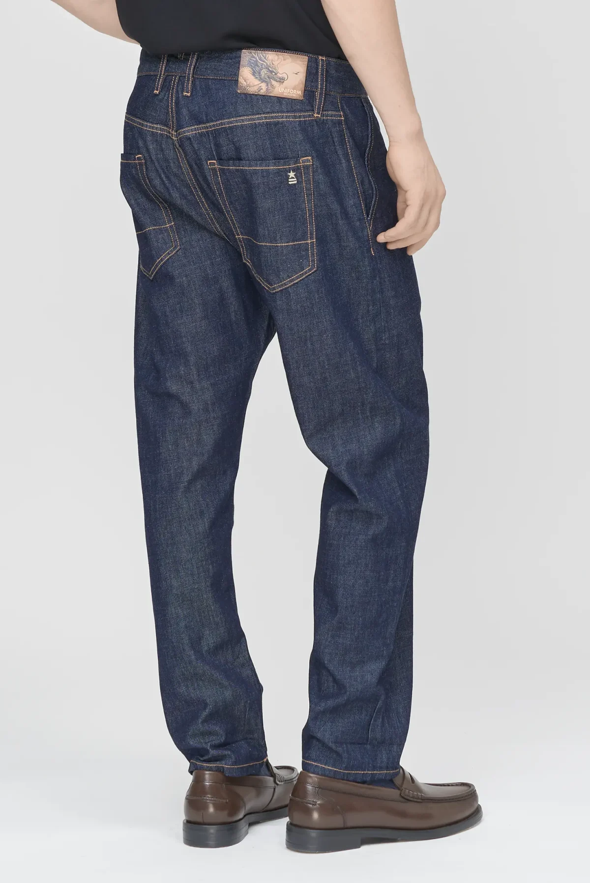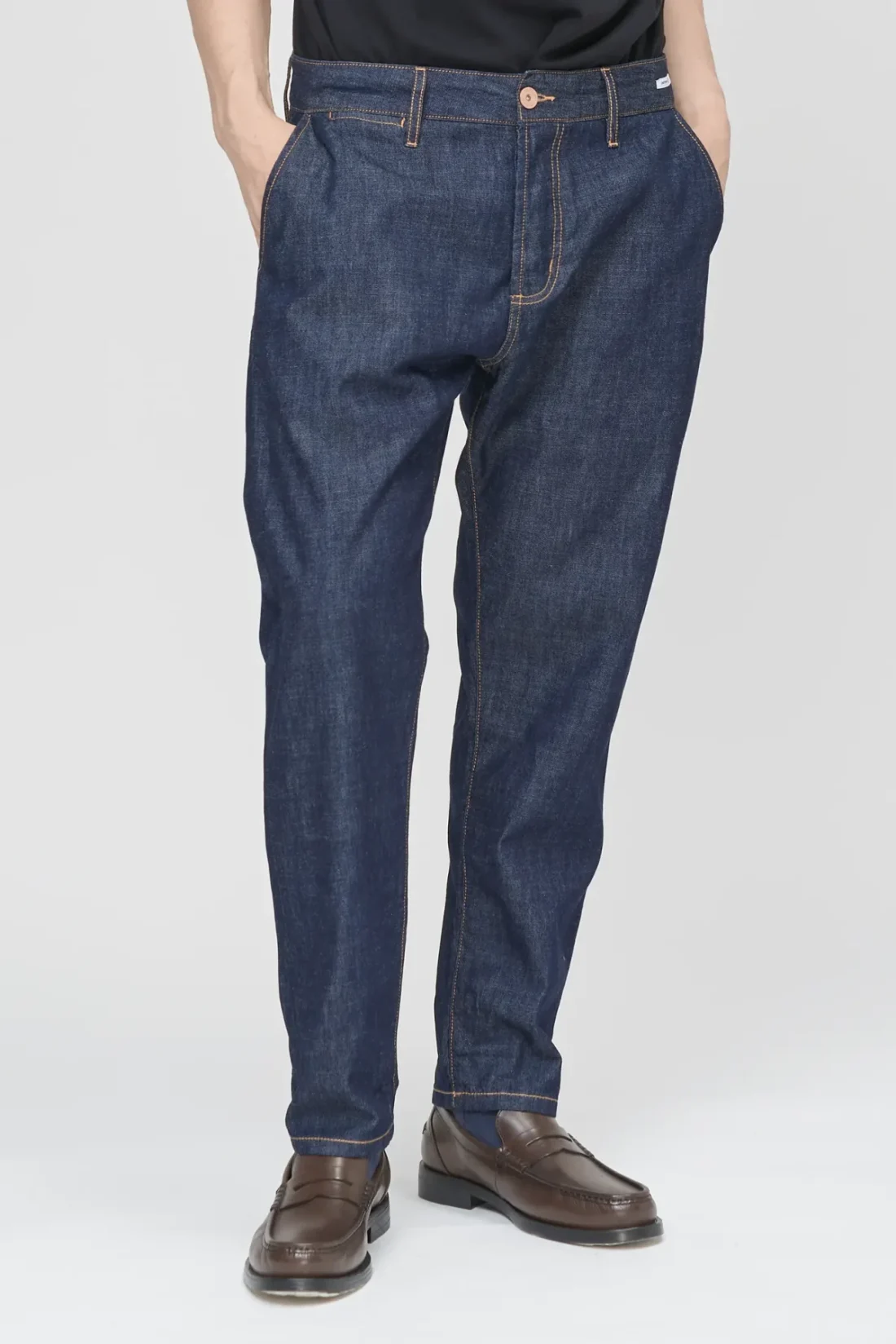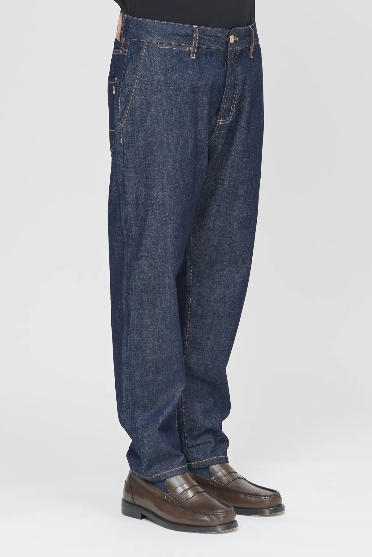Relaxed carrot fit with extra room on the hips and thighs, tapering towards the ankle for a clean, modern silhouette in a Dark Blue Denim. Comfortable and easy to wear, it balances a loose feel with a refined shape.