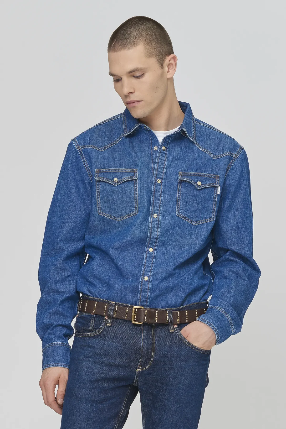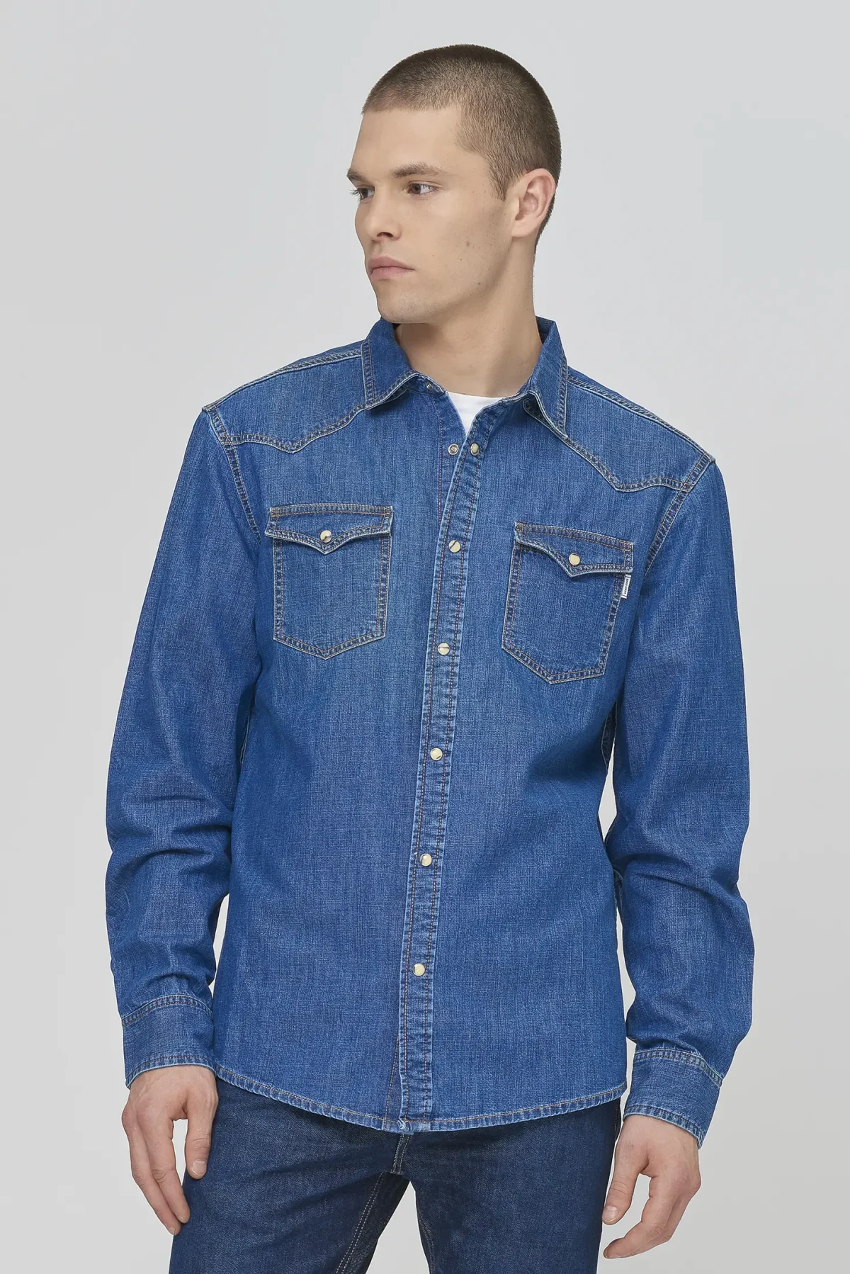 Denim shirt in Medium Blue Denim with a regular fit, designed for a clean yet rugged everyday look. Featuring a classic button-front closure, pointed collar and flap chest pockets, this piece blends workwear inspiration with contemporary styling. Perfect for versatile outfits with a modern, casual attitude.